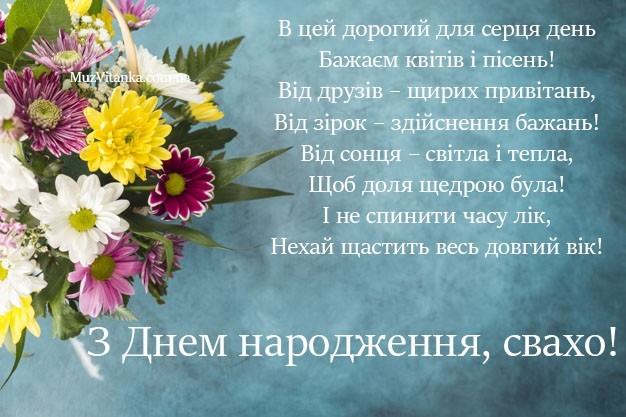 Дорога свахо, вітаємо вас з вашим святковим днем народження! Нехай все буде добре. Нехай вас радують діти, поважають внуки, балує чоловік! Нехай доля подарує вам надійний захист і опору. Нехай у вашому житті не буде болю і страждань. Нехай ваші очі сяють світлом щастя і тепла.